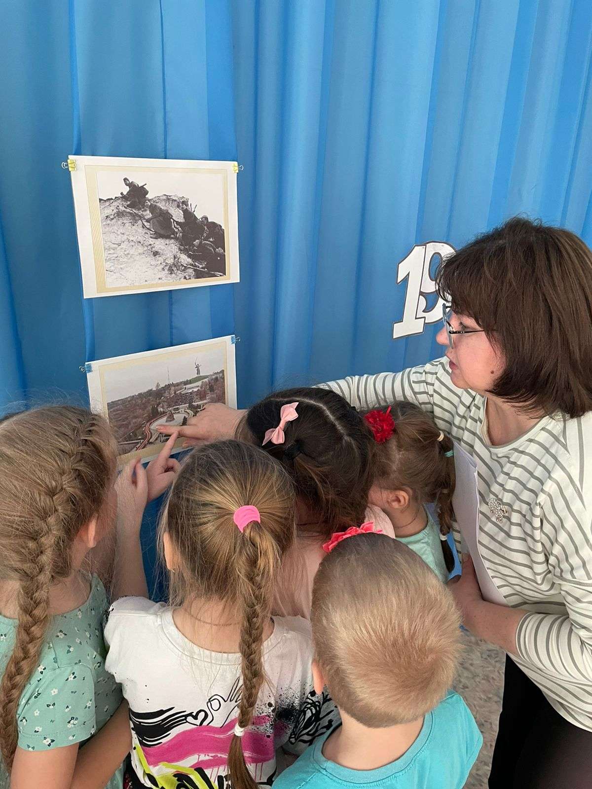 Воспитанники старшего дошкольного возраста посмотрели презентацию о Сталинградской битве, из которой узнали о подвиге воинов — сибиряков, защитниках Сталинграда. В честь которых, названы улицы в их родном городе Барнауле — улица им. 42-й Краснознаменной бригады, 80-й Гвардейской дивизии. Одна из улиц названа в честь Героя Советского Союза Веры Кащеевой, которая в боях за город Сталинград совершила высший воинский подвиг при форсировании Днепра: во время переправы через водную преграду лодка с бойцами, в которой находилась Кащеева, была разбита, погиб командир подразделения. Как высший по званию среди уцелевших бойцов, Кащеева взяла командование на себя. Группа бойцов под её командованием, преодолев реку, закрепилась на берегу и удержала береговой плацдарм.