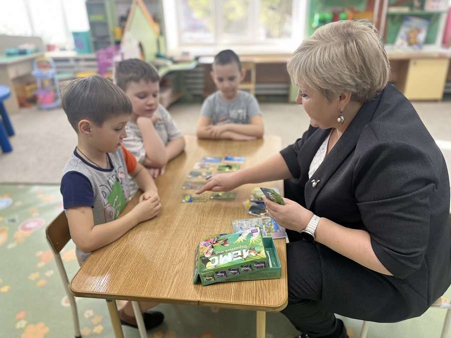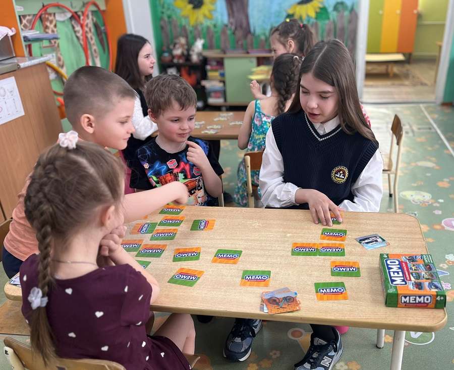 Учитель Наталья Николаевна вместе с вожатыми, после беседы и веселого приветствия, разделившись на три подгруппы, поиграла с детьми в игру мемо по направлениям «Животные», «Транспорт», «Пернатый мир». В каждой подгруппе по количеству набранных карточек определен победитель. Победители отмечены почетными грамотами, а все участники — сладкими угощениями.